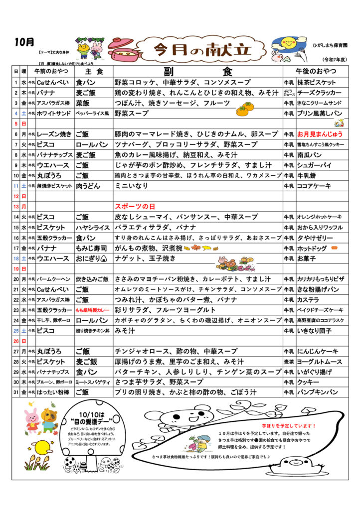 食育基本法の制定に伴い、保育園の給食の目的は乳幼児の心身の発育を促し、健康な生活が出来ることと共に、正しい食事の習慣を集団の中で身につけることにあります。